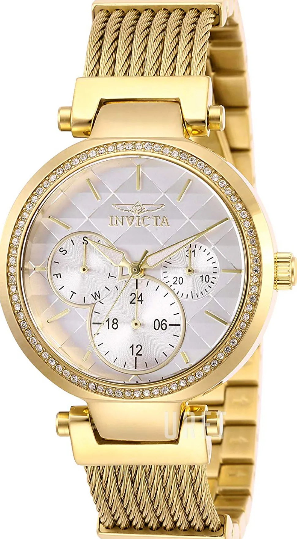 | Bezel (ring): | Gulguldtonat stål, kristallinfattat |