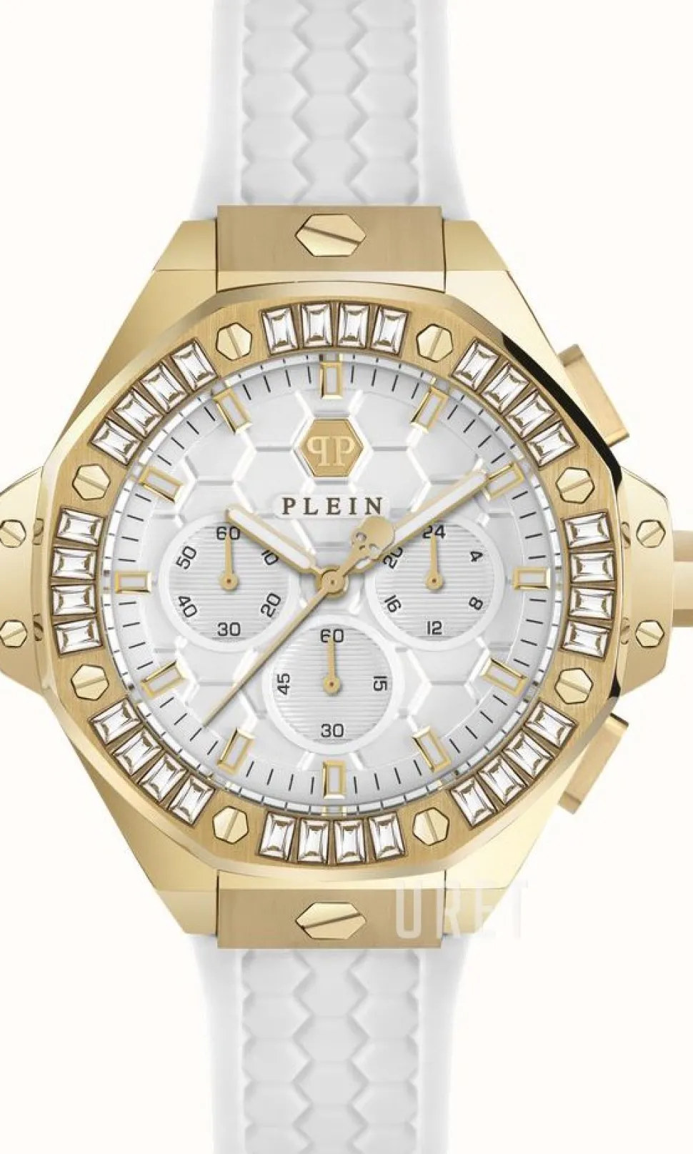 | Bezel (ring): | Gulguldtonat stål, kristallinfattat |