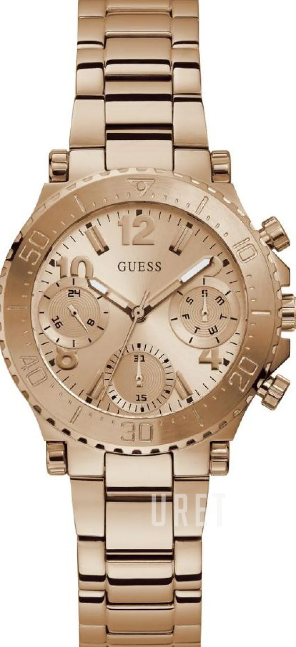 | Urtavla: | Roséguldstonad med arabiska siffror och indexmarkeringar, självlysande visare |