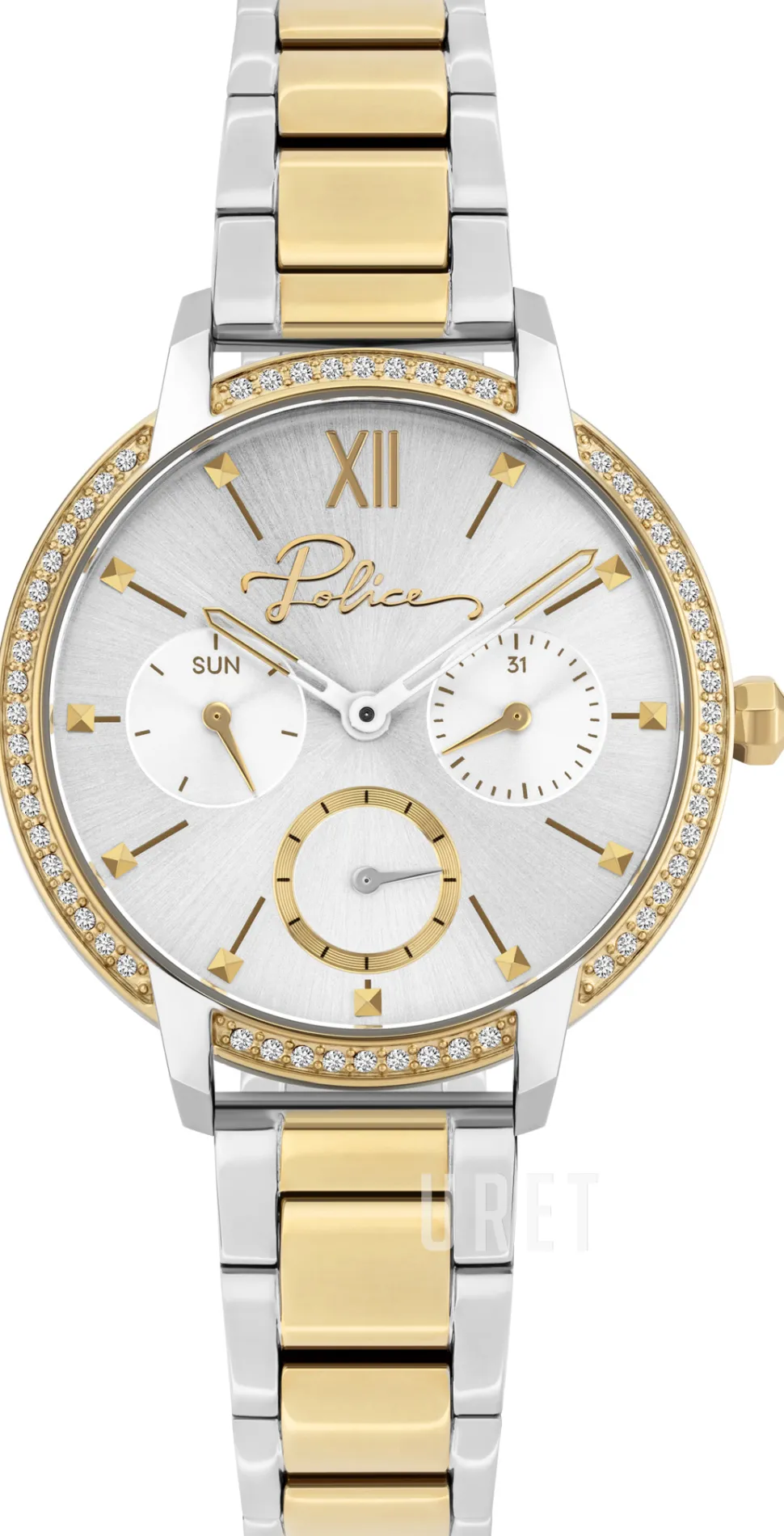 | Bezel (ring): | Gulguldtonat stål, kristallinfattat |