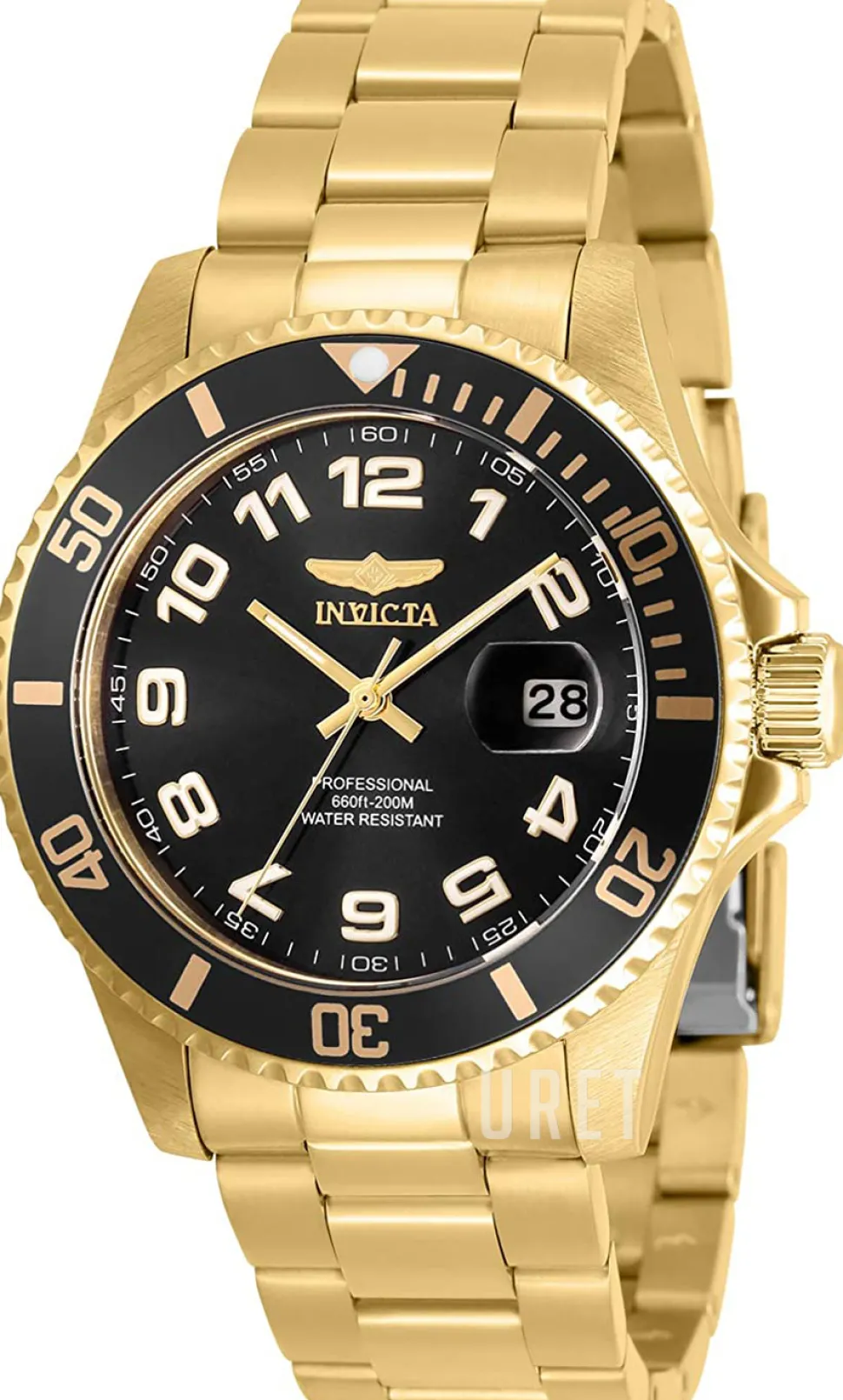 | Bezel (ring): | Gulguldtonat stål, svart, vridbar motsols |