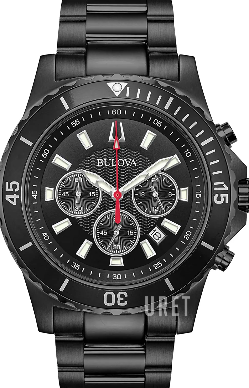 | Bezel (ring): | Stål, svart, vridbar motsols |