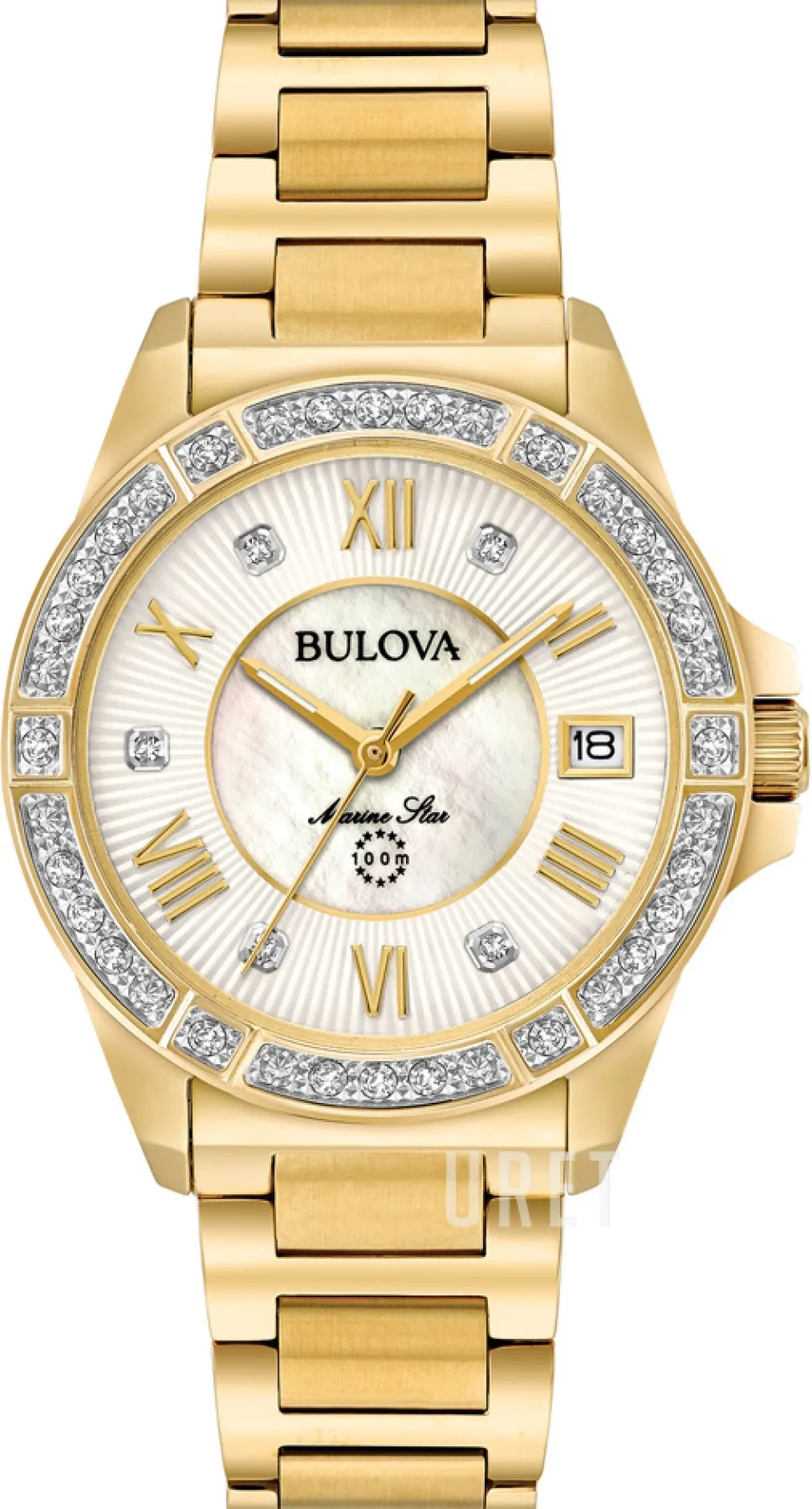 | Urtavla: | Vit pärlemor med diamanter/romerska siffror, självlysande visare |