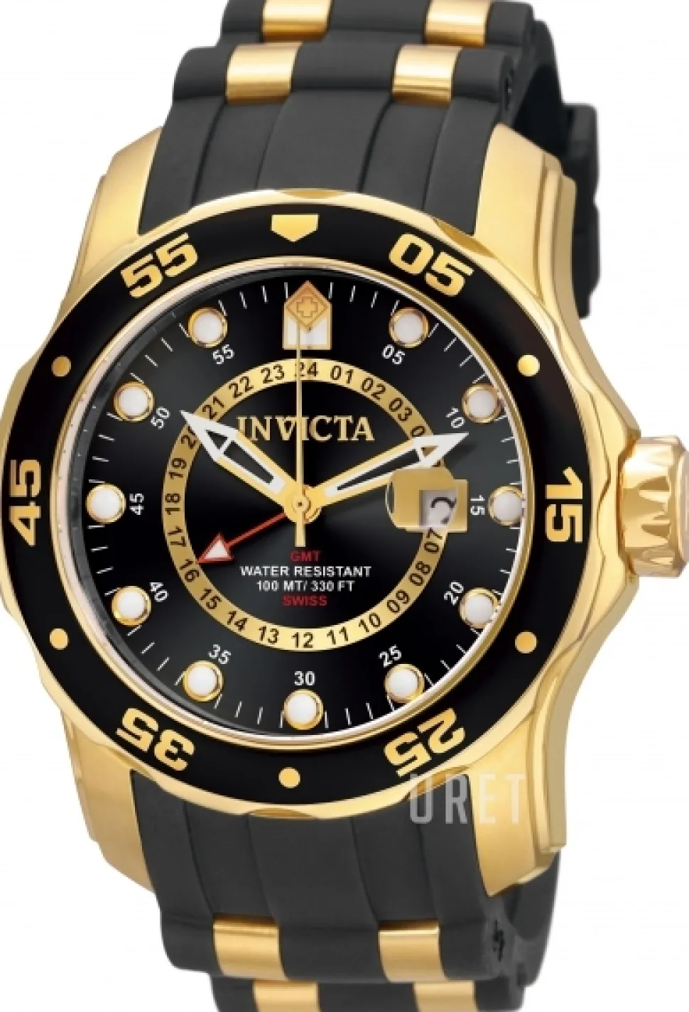 | Bezel (ring): | Gulguldtonat stål, svart, vridbar motsols |