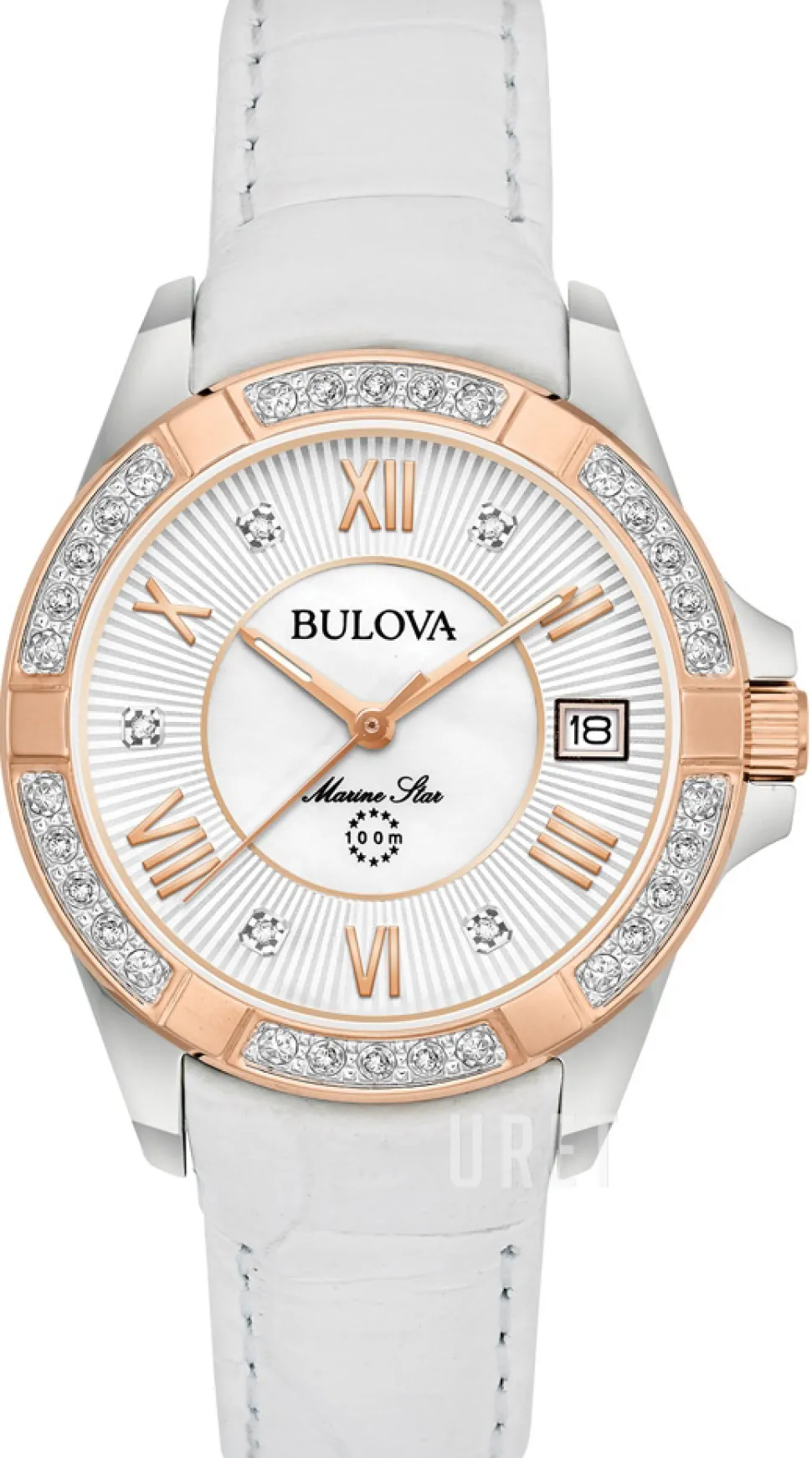 | Urtavla: | Vit pärlemor med diamanter/romerska siffror, självlysande visare |